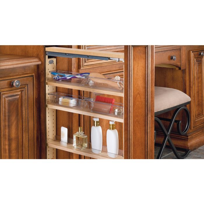 Say goodbye to wasted vanity cabinet space with this wood vanity filler pullout. This pullout unit features natural maple construction, full-extension, TANDEM, 110 lb. rated slides with BLUMOTION soft-close, and four shelves with acrylic accents. A filler matching the cabinet collection would need to be ordered separately.