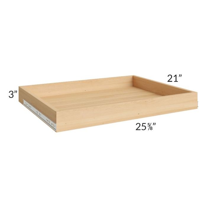 Roll out tray for any 24" deep by 30" wide cabinet. The drawer glides and wood finish for the roll out tray will be the same as the standard drawers for this collection. **Please note, if using with a partial overlay collection (Tribeca Shaker or Glazed Praline), order according to the width of a cabinet, for example, the 15" roll out tray fits a 15" wide base cabinet. For full overlay collections, order according to the width of the cabinet if the roll out is NOT being installed between the hinges. If it will be installed between hinges, order 1 size smaller (for example use the 15" roll out for an 18" wide base cabinet) and use included shims for installation so the tray clears the hinges when opening**