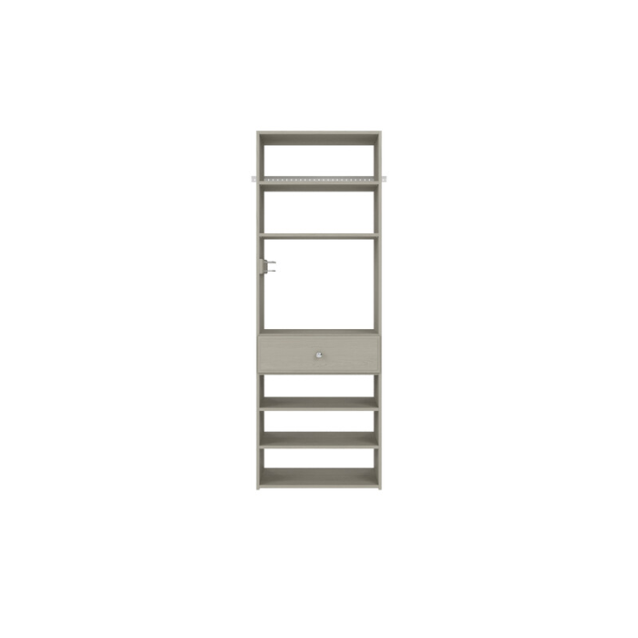 Easy Track's Accessory Tower is the space that holds all the finishing touches to your everyday attire. Say goodbye to scattered items that don't have a home! No more rushing out the door in search of unfound items or staring at unmanageable clutter. House your jewelry, purses, shoes, and more in this thoughtful space. Avoid tangled necklaces with a holding hook rack. Store shoes of any height with adjustable shelving. Use the drawer for hidden storage.