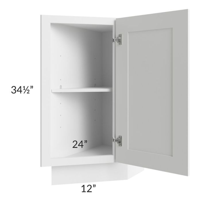Full height door cabinet that is meant to be used at the end of a cabinet run. It will have a 24" deep side on the left which gets installed against the adjacent cabinet. The door is angled and the exposed side of the cabinet (on the right) will be 12" deep. Comes with 1 shelf.