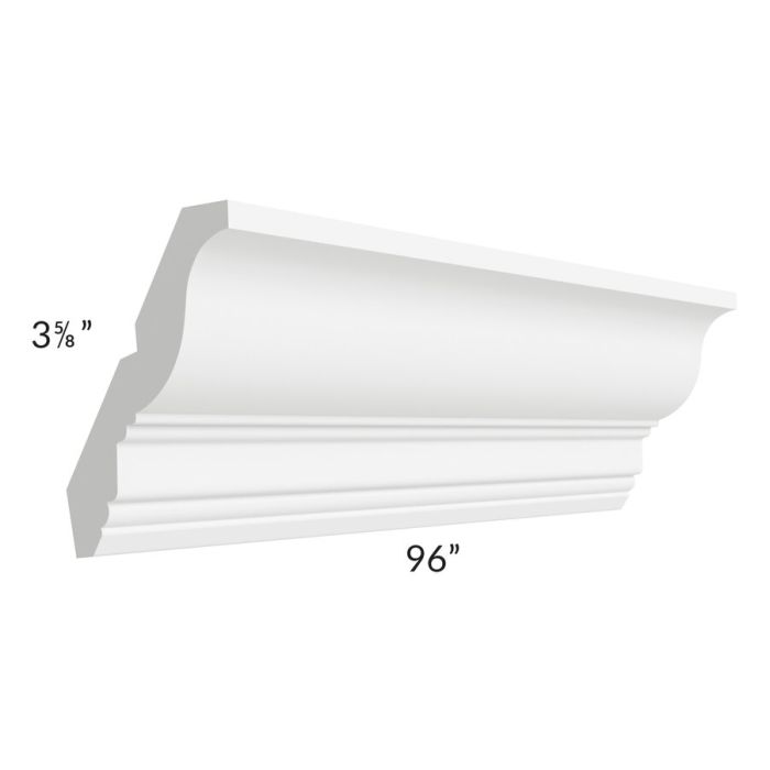 Crown molding that comes in an 8 foot strip. Commonly used to finish the top of wall cabinets. Once installed, the crown will stick out abut 2-27/32" from the cabinet and the height off the cabinet will be about 3-5/8".