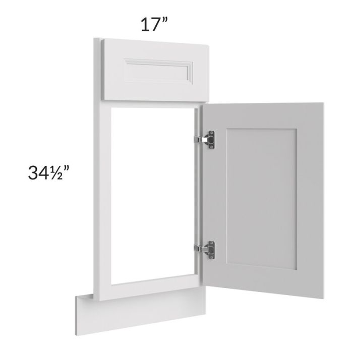 Diagonal corner sink front that will take up 36" of wall space from the corner out, on each wall, once installed. The door width is 14-1/2". This cabinet will have a partial overlay door to ensure it opens without hitting the adjacent cabinet, so there will be about 1-1/8" of face frame, visible on either side of the door. The corner sink front floor must be ordered separately (SKU DSFL36).