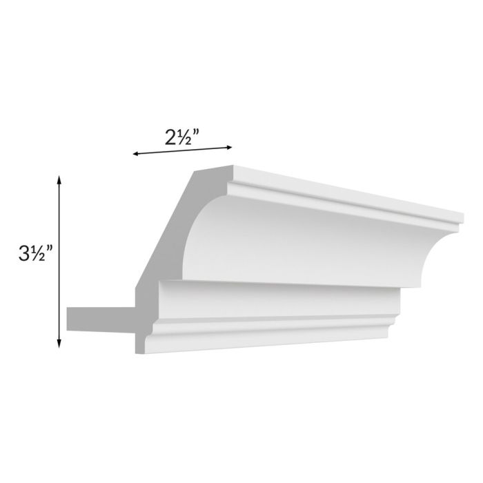 Royal crown molding, when installed, it will be 3-1/2" high and will stick out from the cabinet 2-1/2". Can be used with the Rope or Dentil molding inlays (SKU RM or DM).