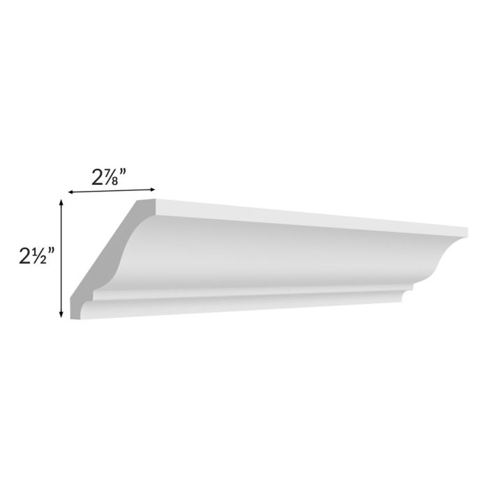 Small crown molding, when installed, it will be 2-1/2" high and will stick out from the cabinet 2-7/8".
