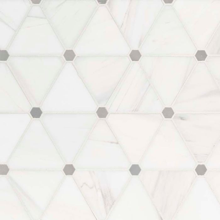 Bianco Dolomite Pinwheel Tile features geometric tiles in timeless marble but with a fun and contemporary pinwheel design. The natural stone in white with gray accents and a pretty polished finish of this backsplash tile is recommended for geometric floor tiles, countertops, shower surrounds, and patterned wall tiles.