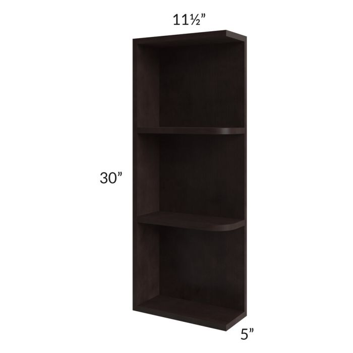 Wall end shelf cabinet with 2 open non-adjustable shelves. The top and bottom panels will have squared corners and the adjustable shelves will have rounded corners. This cabinet is reversible.