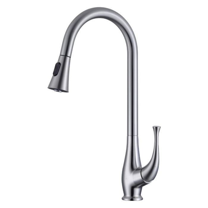 Brushed nickel kitchen faucet with pull down faucet head.