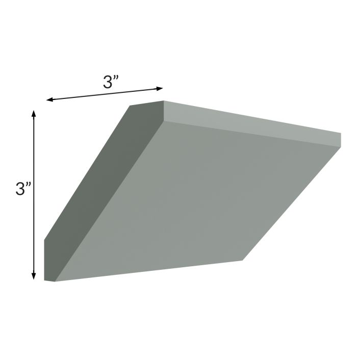 Large angled crown molding that is approximately 3/4" thick. Once installed, the molding will stick out from the cabinet about 3", and will be about 3" high.