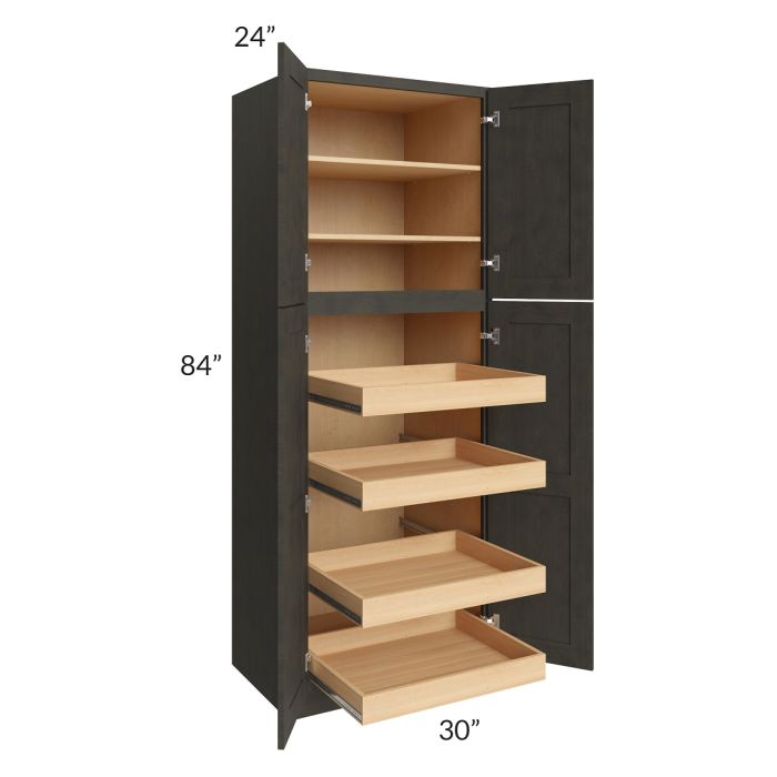 Charcoal Grey Shaker 30x84x24 Wall Pantry Cabinet with 4 Rollout Trays