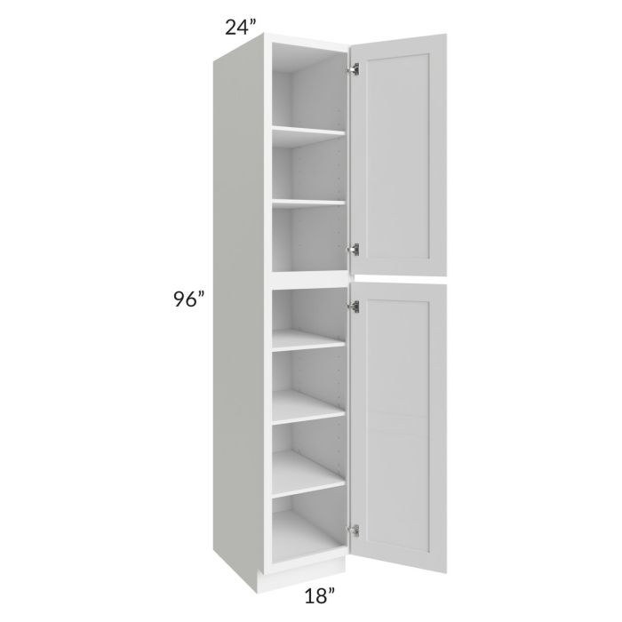 Wall pantry cabinet with 2 doors, 1 smaller door on top and 1 larger door on bottom. This pantry cabinet comes with 1 fixed shelf and 6 adjustable shelves. Measurements are as follows: Top/Middle/Bottom door width = 17 9/16". Top door height = 41 5/16". Middle/Bottom door height = 49 1/4".