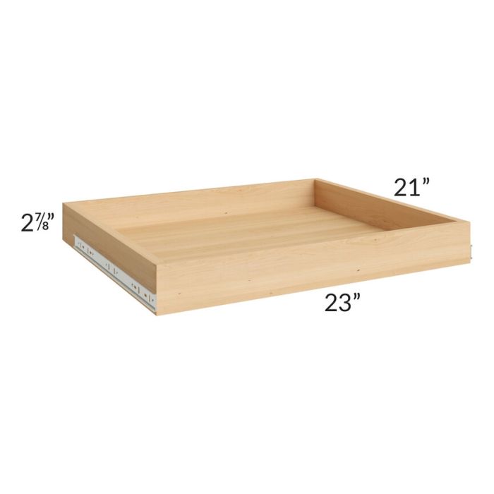 Roll out tray to be used with a 27" wide base cabinet. The roll out tray will come pre-assembled, dovetailed, and have a soft close full extension track. They are solid birch with a natural maple finish. *Please note this roll out tray will only work with this collection*