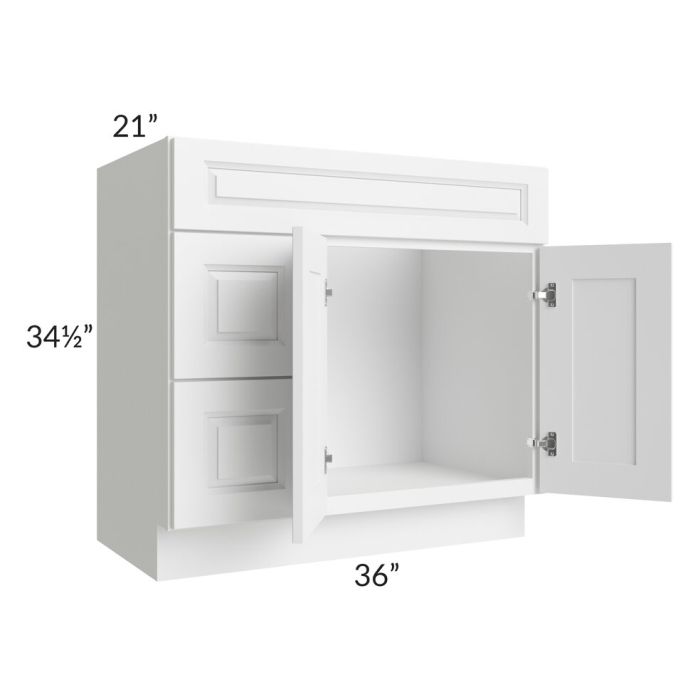 Bathroom vanity that has 2 doors on the right, 1 fake drawer front on top, and 2 drawer on the left.