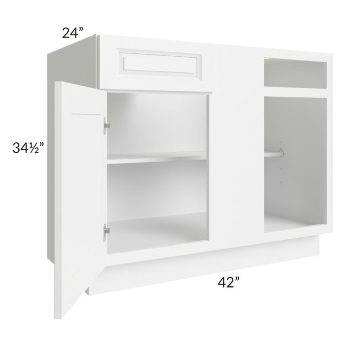 1 door blind base corner cabinet. The actual width is 42" however it will take up a minimum of 45" of wall space and can be pulled up to 48". This cabinet has 1 drawer and is reversible. The door/drawer width is 17-1/2”, blind opening is 14 7/8”. The drawer and door opening will be 3" less than the width of the door and drawer front. A filler will be needed between the blind and adjacent cabinet to ensure the drawer and door open properly; the filler must be purchased separately.