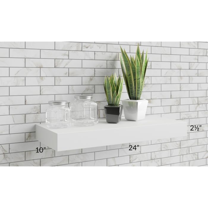 Floating shelf that must be installed between two cabinets, or between one cabinet and a wall. The shelf will be finished to match on the front, sides, top and bottom. The maximum load is 15 lbs per linear foot. *Please note that the floating shelves are not trimmable.*