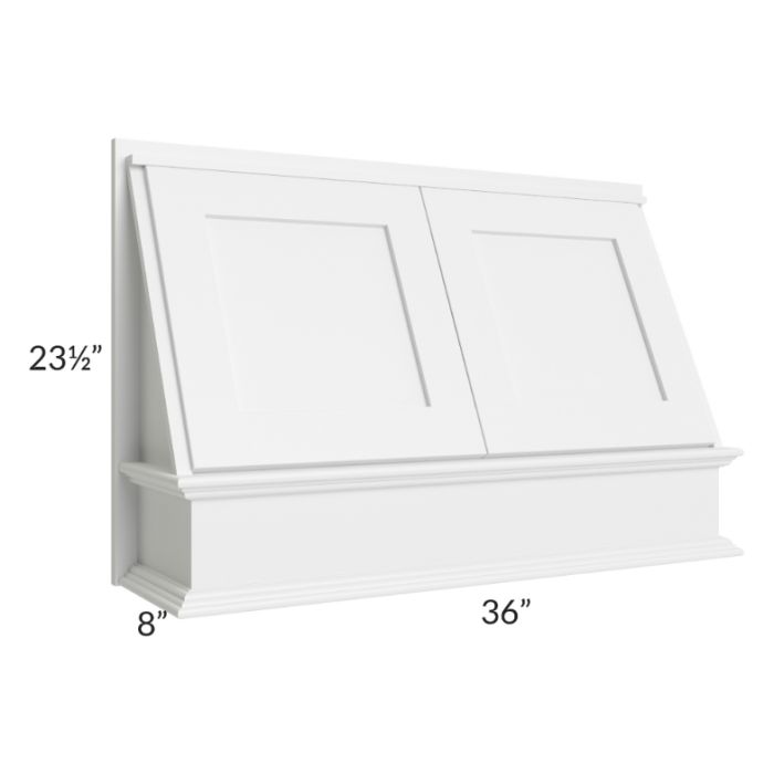 Range hood front that must be installed between 2 cabinets for support. Before installation of the range hood front, the blower should be installed and the depth adjusted using fillers and/or panels to fit the blower. The sides will be pre-finished to match.