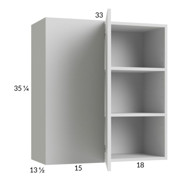 Blind corner wall cabinet that takes up a minimum of 33" of wall space and can be pulled up to 36". The actual cabinet width is 33", it can be installed right against the corner if needed, or pulled a maximum of 3" from the corner. This cabinet is reversible. The door width is 18" and the blind section width is 15". A filler must be installed between the blind cabinet and the adjacent wall cabinet (so it's perpendicular to the blind cabinet).