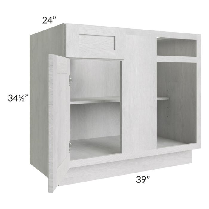1 door blind base corner cabinet. The actual width is 39" however it will take up a minimum of 42" of wall space and can be pulled up to 45". This cabinet has 1 drawer and is reversible. The door/drawer width is 14-9/16”, blind opening is 11 7/8”. The drawer and door opening will be 3" less than the width of the door and drawer front. A filler will be needed between the blind and adjacent cabinet to ensure the drawer and door open properly; the filler must be purchased separately.