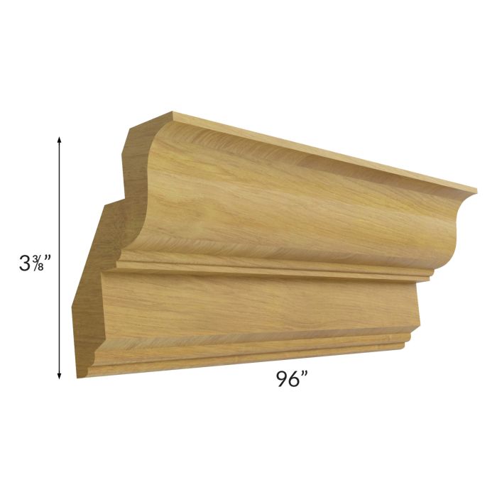 Crown molding that comes in 8 ft long sections. When applying crown to full overlay cabinets, a crown backer will be required (block of wood that is installed to the top of the cabinet where the crown will be attached to). When installed, crown is 3-3/8"H and sticks out from the cabinet 2-1/2". There is a flat part to accommodate a rope insert (ROPE8) installation if desired.