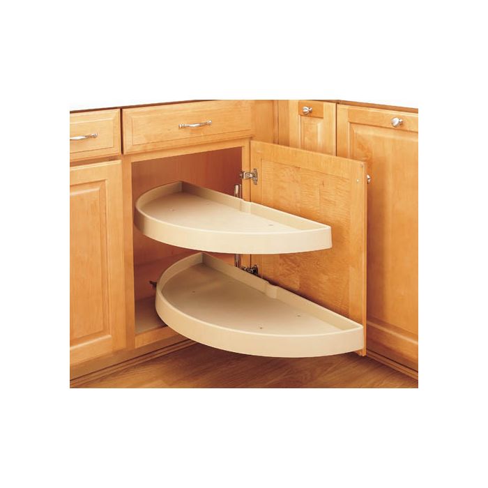 Half moon shelf system available in polymer finish. Includes 90 degree hinge brackets in addition to standard and mounting brackets. Two (2) shelf pivot only, 13-1/4" minimum opening required.