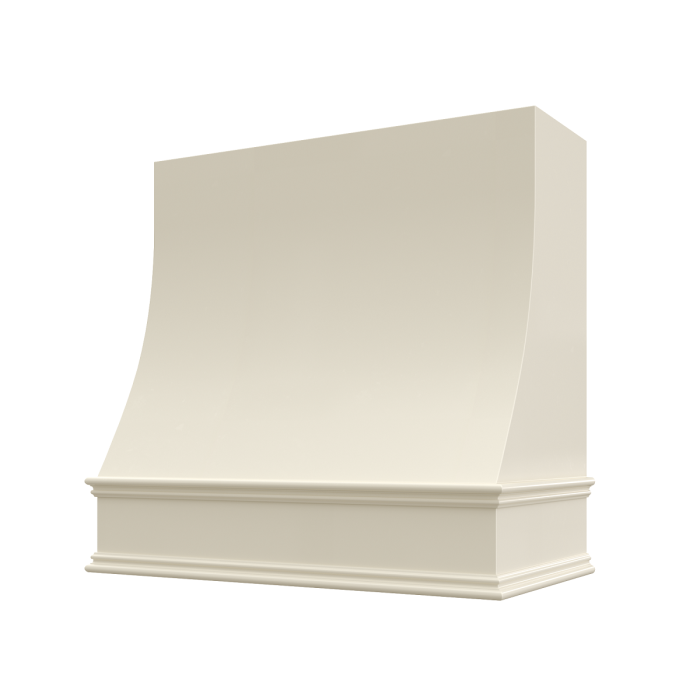 Sloped, smooth hood with classic molding. Features a plywood and Maple construction. The hood base front panel is 42" but at the widest point with the molding, the total width is 43-1/2". The side panel is 19-1/2" deep, and 20-1/4" deep with the molding. The top of the chimney is 42" wide and 12" deep and the chimney section is trimmable by 6" to make the total height 42", if needed. The height of the panel and molding section on bottom is 8-1/4". The hood has a two-piece construction for easy mounting and access to fan and ducting. Ships assembled.