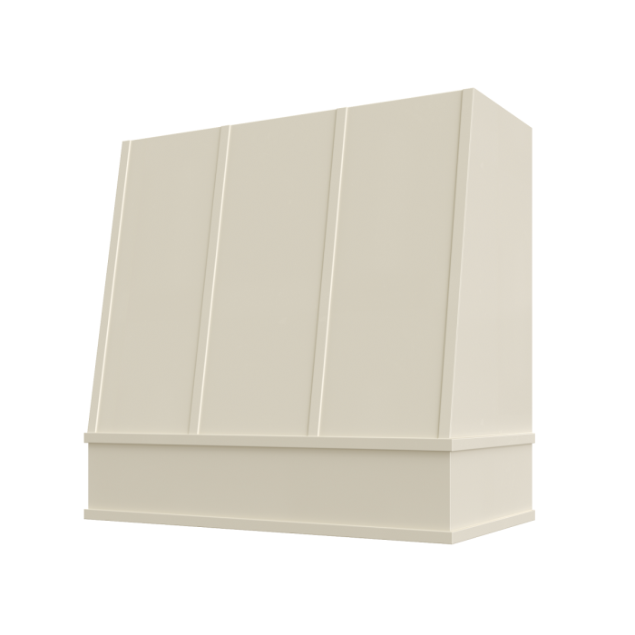 Strapped, angled hood with block molding. Features a plywood and Maple construction. The hood base front panel is 42" but at the widest point with the molding, the total width is 43-1/2". The side panel is 19-1/2" deep, and 20-1/4" deep with the molding. The top of the chimney is 42" wide and 14-1/2" deep and the chimney section is trimmable by 6" to make the total height 42", if needed. The height of the panel and molding section on bottom is 8-1/4". The hood has a two-piece construction for easy mounting and access to fan and ducting. Ships assembled.