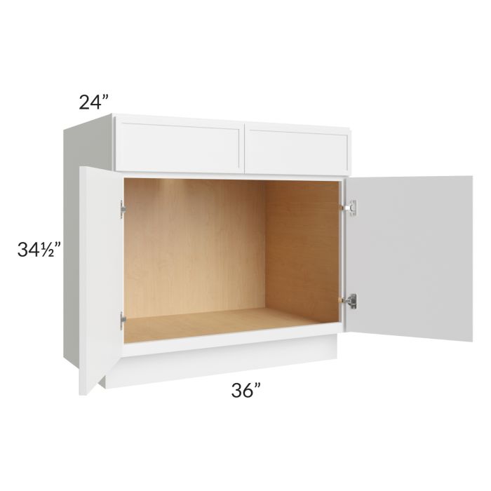 2 door sink base cabinet with 2 fake drawer fronts and no shelves. Cabinet has butt doors.