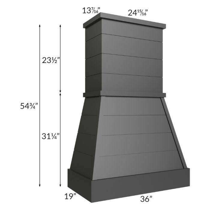 Farmhouse style wood hood that comes with a stainless steel liner. The chimney height of 23-1/2" can be trimmed on site, if needed. Blower is not included and would need to be purchased separately. The chimney depth is 13-7/16" and the width is 24-15/16".