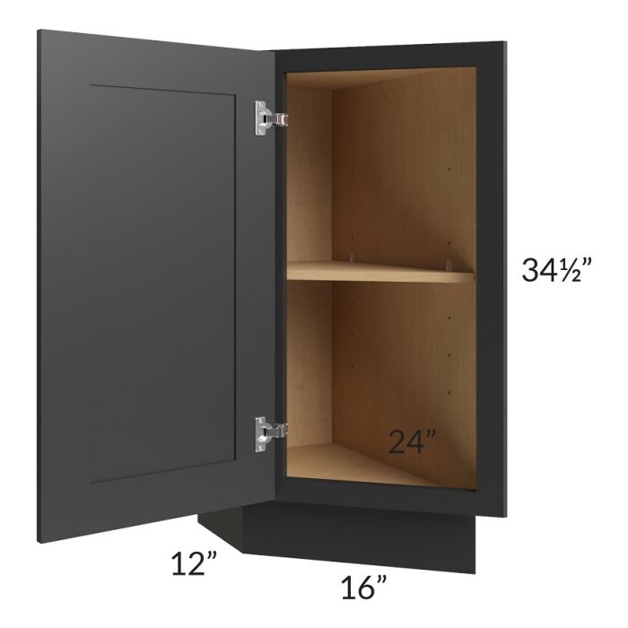 Full height door cabinet that is meant to be used at the end of a cabinet run. It will have a 24" deep side on the right which gets installed against the adjacent cabinet. The door is 16" wide and angled. The exposed side of the cabinet (on the left) will be 12" deep. The door will always be hinged on the 12" deep side.