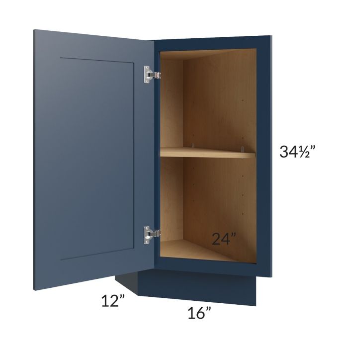 Full height door cabinet that is meant to be used at the end of a cabinet run. It will have a 24" deep side on the right which gets installed against the adjacent cabinet. The door is 16" wide and angled. The exposed side of the cabinet (on the left) will be 12" deep. The door will always be hinged on the 12" deep side.