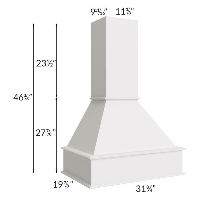 Signature style wood hood that comes with a stainless steel liner. The chimney height of 23-1/2" can be trimmed on site, if needed. Blower is not included and would need to be purchased separately. The chimney depth is 9-11/16" and the width is 11-3/8".