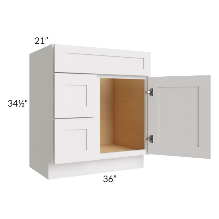 Vanity sink and drawer base combo cabinet with (1) 17-1/2" wide door on the right, (1) 6-3/4" high false drawer front across the top of the entire cabinet, and (2) 11-1/2" high drawers on the left. This cabinet will not have any shelves. Door is hinged on the right.