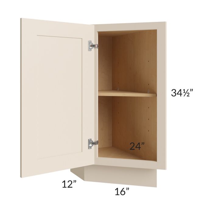 Full height door cabinet that is meant to be used at the end of a cabinet run. It will have a 24" deep side on the right which gets installed against the adjacent cabinet. The door is 16" wide and angled. The exposed side of the cabinet (on the left) will be 12" deep. The door will always be hinged on the 12" deep side.