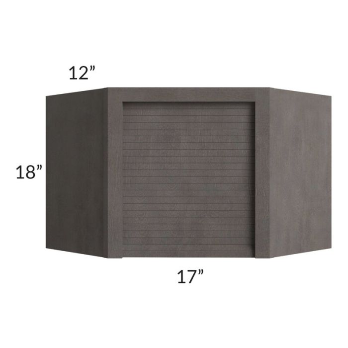 Appliance garage with a front width of 17". It will have a roll up, tambour door and is designed to fit under a 24x24 diagonal corner wall cabinet. The door opening is approximately 14" wide, the tambour door is partially inserted into the frame on either side.