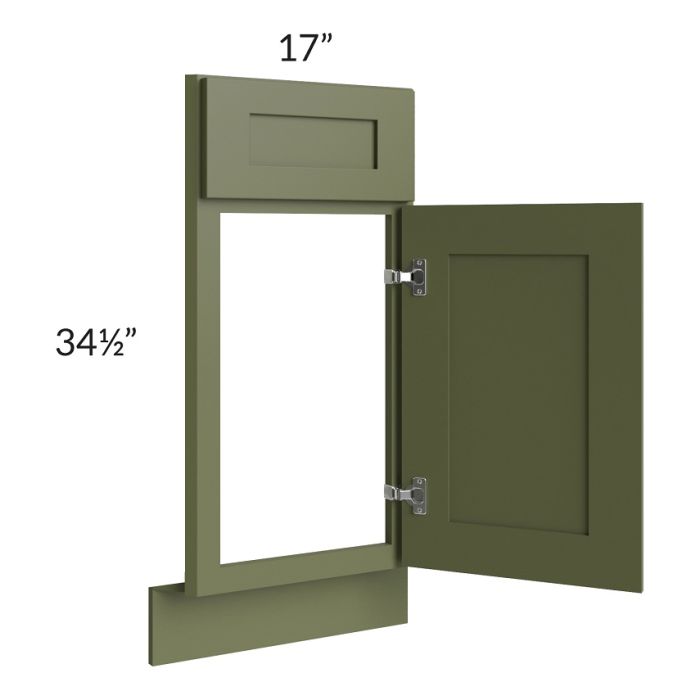 Diagonal corner sink front that will take up 36" of wall space from the corner out, on each wall, once installed. The door width is 14-1/2" and the face frame width is 17". This cabinet will have a partial overlay door to ensure it opens without hitting the adjacent cabinet, so there will be about 1-1/8" of face frame, visible on either side of the door. The corner sink front floor must be ordered separately (SKU DSFL36).