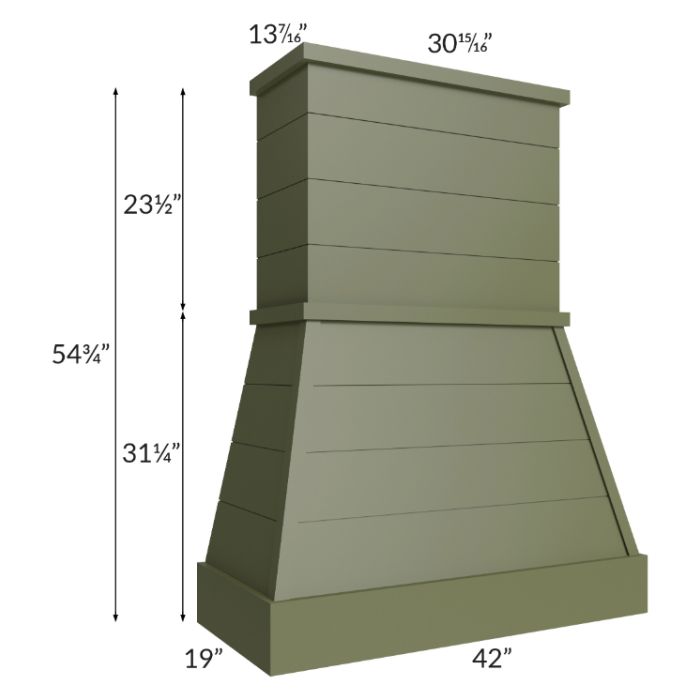 Farmhouse style wood hood that comes with a stainless steel liner. The chimney height of 23-1/2" can be trimmed on site, if needed. Blower is not included and would need to be purchased separately. The chimney depth is 13-7/16" and the width is 30-15/16".