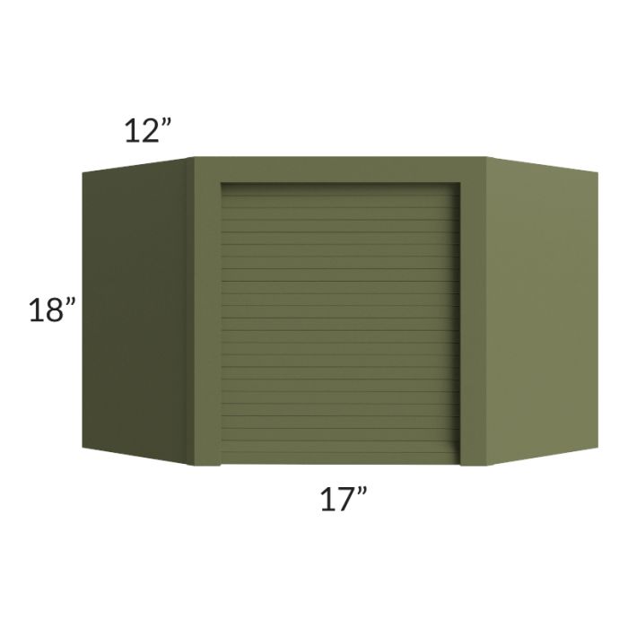 Appliance garage with a front width of 17". It will have a roll up, tambour door and is designed to fit under a 24x24 diagonal corner wall cabinet. The door opening is approximately 14" wide, the tambour door is partially inserted into the frame on either side.