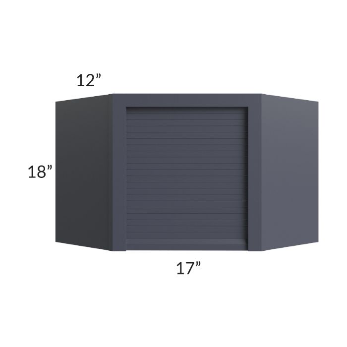 Appliance garage with a front width of 17". It will have a roll up, tambour door and is designed to fit under a 24x24 diagonal corner wall cabinet. The door opening is approximately 14" wide, the tambour door is partially inserted into the frame on either side.