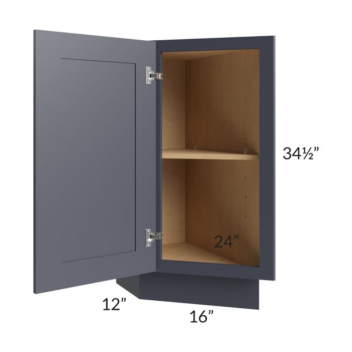 Full height door cabinet that is meant to be used at the end of a cabinet run. It will have a 24" deep side on the right which gets installed against the adjacent cabinet. The door is 16" wide and angled. The exposed side of the cabinet (on the left) will be 12" deep. The door will always be hinged on the 12" deep side.