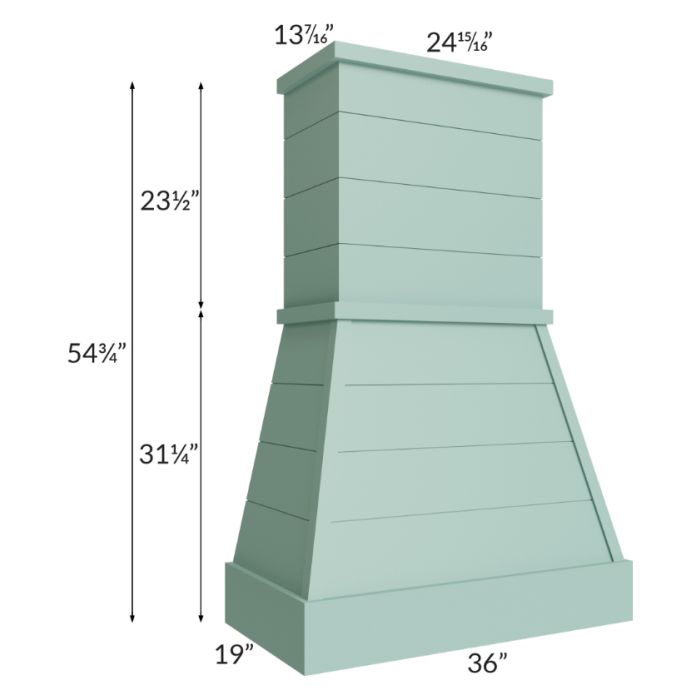 Farmhouse style wood hood that comes with a stainless steel liner. The chimney height of 23-1/2" can be trimmed on site, if needed. Blower is not included and would need to be purchased separately. The chimney depth is 13-7/16" and the width is 24-15/16".