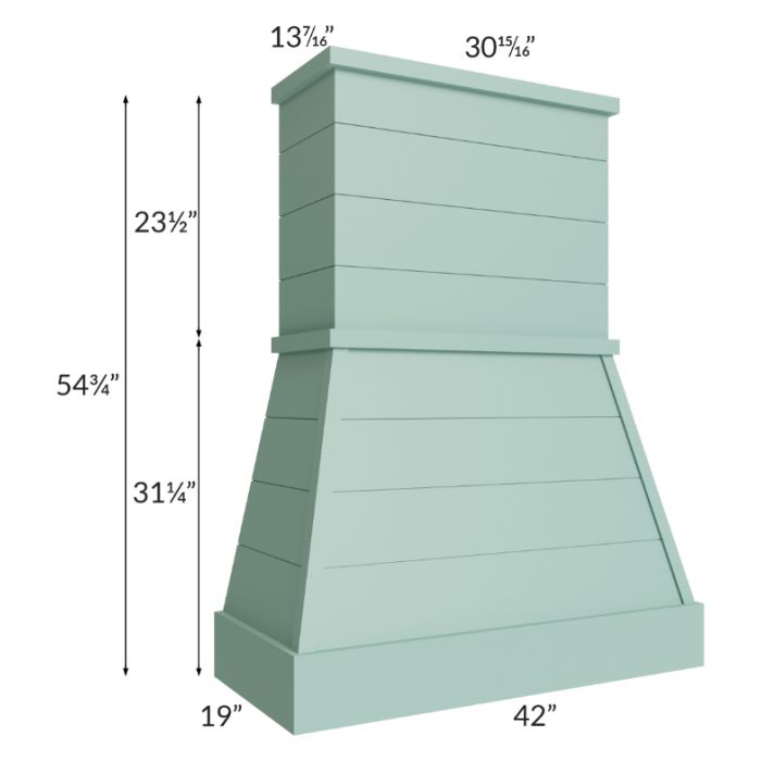 Farmhouse style wood hood that comes with a stainless steel liner. The chimney height of 23-1/2" can be trimmed on site, if needed. Blower is not included and would need to be purchased separately. The chimney depth is 13-7/16" and the width is 30-15/16".