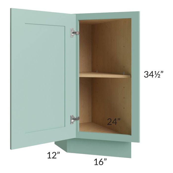 Full height door cabinet that is meant to be used at the end of a cabinet run. It will have a 24" deep side on the right which gets installed against the adjacent cabinet. The door is 16" wide and angled. The exposed side of the cabinet (on the left) will be 12" deep. The door will always be hinged on the 12" deep side.