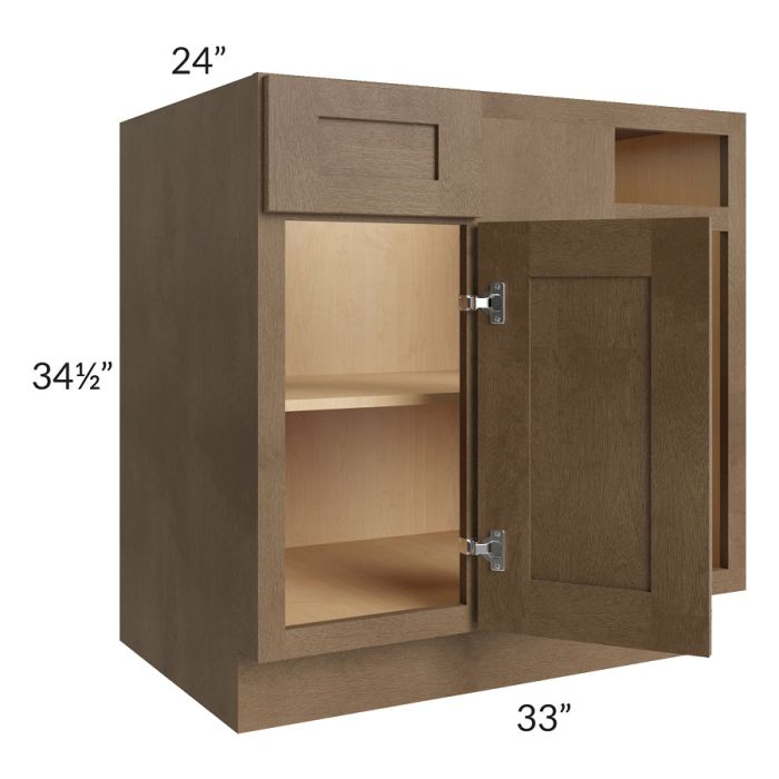 1 door blind base corner cabinet with 1 drawer and 1 shelf. The actual width is 33", but must be pulled at least 6-1/2" from the corner, taking up 39" of wall space. It can be pulled a max of 12-1/2", taking up 45" of wall space. The door width is 12-3/4", the stile width is 10-1/4" and the blind opening width is 9-3/4". A filler must be used between the blind and the adjacent cabinet so the doors and drawers are able to open without interference. The filler must be purchased separately. When selecting the blind location, it is as if facing the cabinet, if Left is selected, the blind will be on the left side of the cabinet and the door will be on the right side. The door will always be hinged on the side closes to the blind side of the cabinet (for example, a blind cabinet with the blind on the left side will have the door hinged on the left side as well). It cannot be hinged closest to the outside of the cabinet because it will restrict access trying to get in and out of the cabinet.