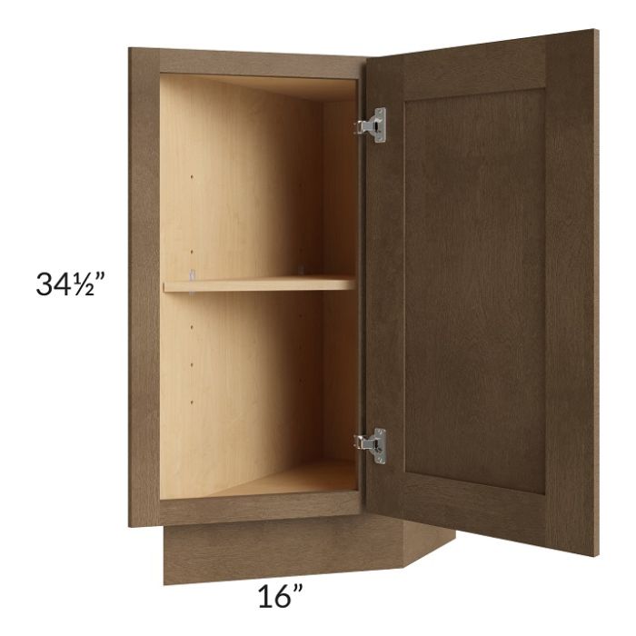 Full height door cabinet that is meant to be used at the end of a cabinet run. It will have a 24" deep side on the left which gets installed against the adjacent cabinet. The door is 16" wide and angled. The exposed side of the cabinet (on the right) will be 12" deep.