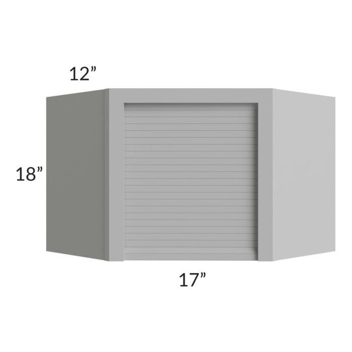 Appliance garage with a front width of 17". It will have a roll up, tambour door and is designed to fit under a 24x24 diagonal corner wall cabinet. The door opening is approximately 14" wide, the tambour door is partially inserted into the frame on either side.