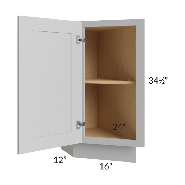 Full height door cabinet that is meant to be used at the end of a cabinet run. It will have a 24" deep side on the right which gets installed against the adjacent cabinet. The door is 16" wide and angled. The exposed side of the cabinet (on the left) will be 12" deep. The door will always be hinged on the 12" deep side.