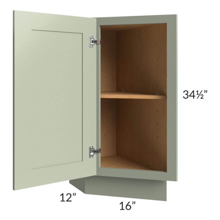 Full height door cabinet that is meant to be used at the end of a cabinet run. It will have a 24" deep side on the right which gets installed against the adjacent cabinet. The door is 16" wide and angled. The exposed side of the cabinet (on the left) will be 12" deep. The door will always be hinged on the 12" deep side.