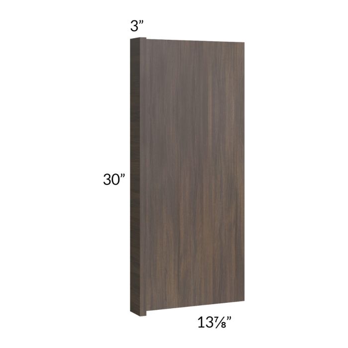 Wall end panel with a filler attached to the front that will be finished on two sides and edge-banded on all four edges. The filler on the front will be flush with the side and can be cut down if needed. If it is cut, to avoid damage to the frame and side panels, please apply extra care when cutting the front panel, blue masking tape is the most commonly used to avoid splintering (strong adhesives must be avoided to avoid pulling the finish off).