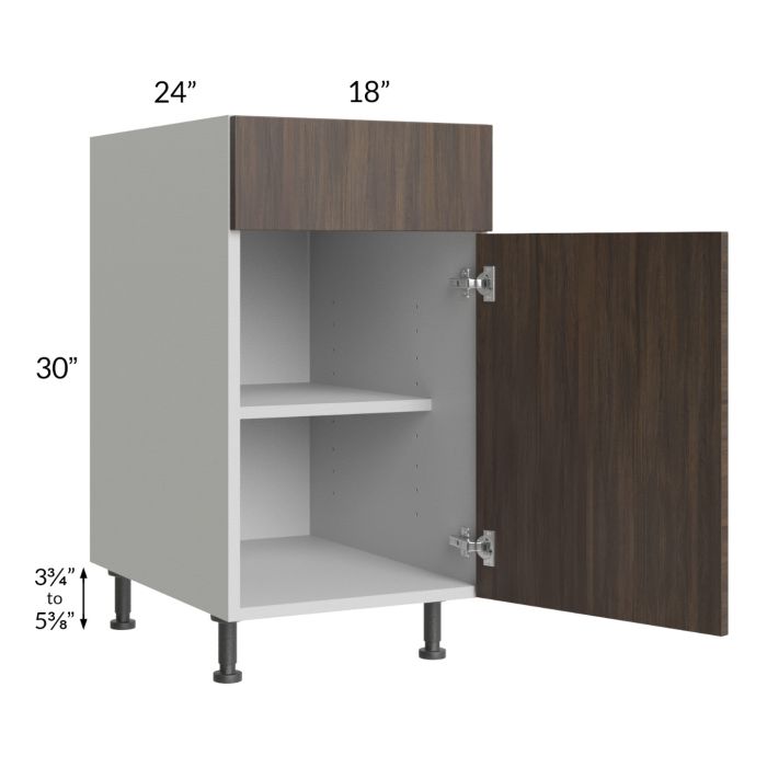 1 door base cabinet with (1) 18" deep adjustable shelves and 1 drawer. Black, adjustable, plastic furniture feet will also be included which will add 3-3/4" to 5-3/8" to the 30" height.