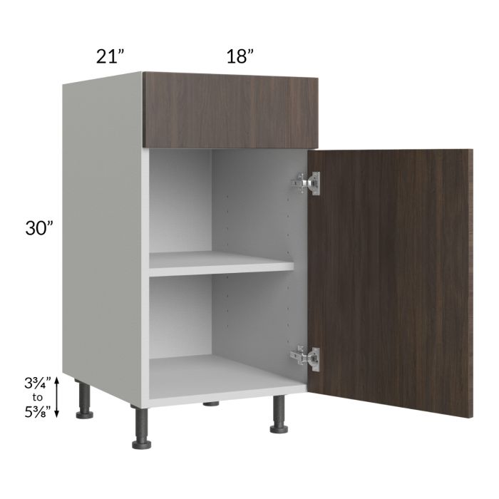 Vanity base cabinet with (1) door, (1) drawer, and (1) 18" deep shelf. The drawer front is 6-3/4" high. Black, adjustable, plastic furniture feet will also be included which will add 3-3/4" to 5-3/8" to the 30" height.