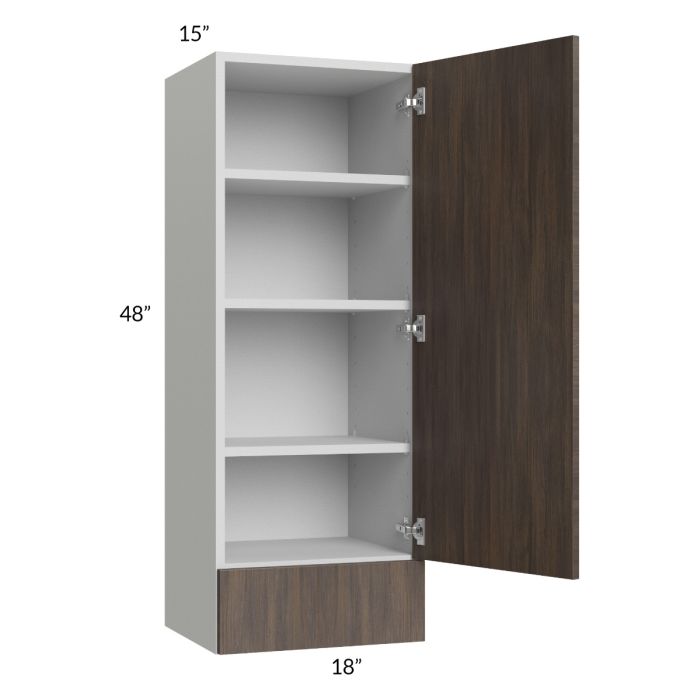 Wall cabinet with (1) 6-3/4" drawer on bottom (drawer front height) and (1) 41" high door on top. There will be 3 adjustable shelves on the top of the cabinet. The exposed sides have near-flush ends and are unfinished, wainscot panels can be ordered to finish exposed sides. **Note this cabinet has a 15" depth**
